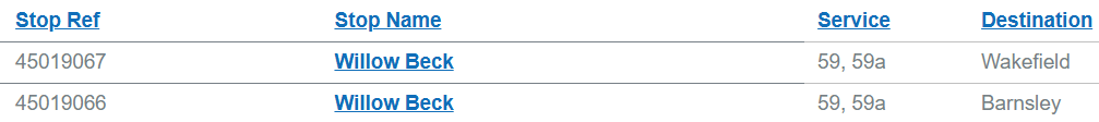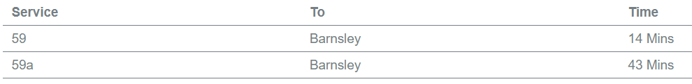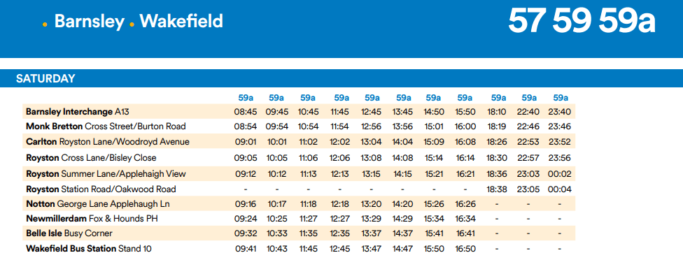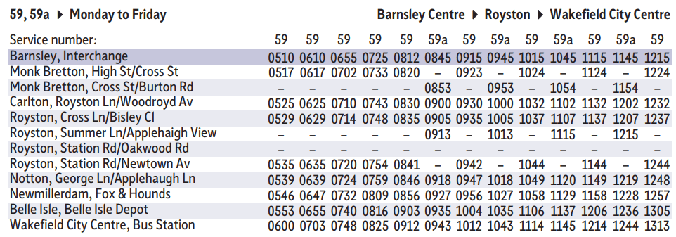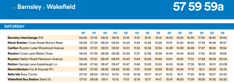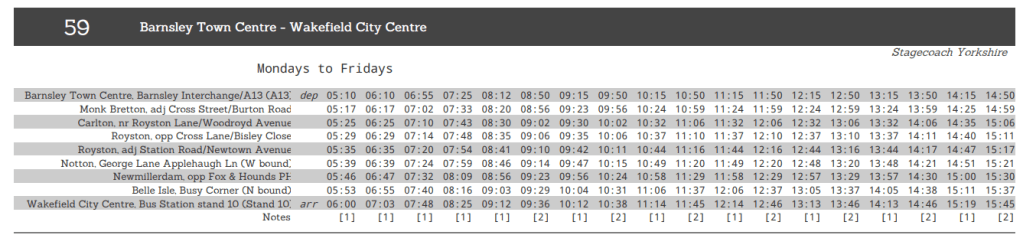 Before I completely lose the will to live, I revisit the Travel South Yorkshire website and try a timetable search for the 59 bus route – and up pops a pdf file containing the full service, all in one table! It’s clearly not a direct reproduction of the database output – or if it is, then it’s been interpreted by an actual human to ensure that it shows my full service!