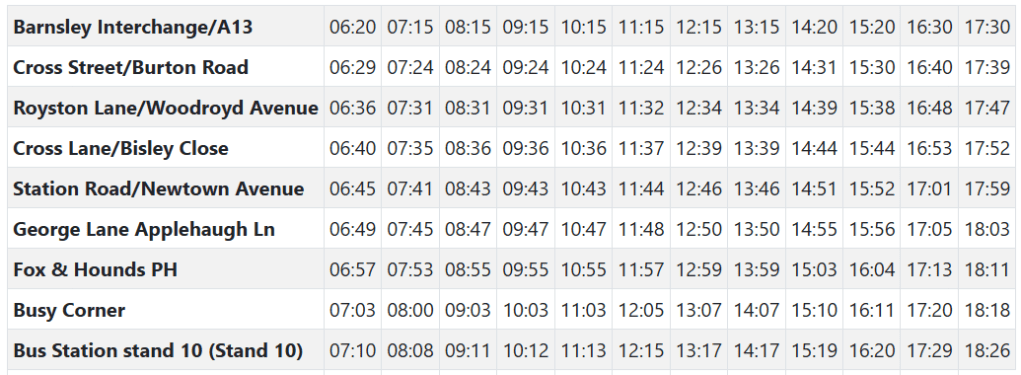 Take last year as an example. Stagecoach uploaded a new timetable dataset to the government website and ‘forgot’ to mark the main bus stop in Notton as a timetable point in their data, so none of the online timetables included any reference to buses calling at Notton. Fortunately, Stagecoach published its own timetables online in pdf format, so the information was out there – providing you knew where to look for it. Several months passed before either West Yorkshire or South Yorkshire Combined Authorities updated their web pages to show the times of buses from Notton, all down to a simple error by Stagecoach in not ‘flagging’ the Notton bus stop as a timing point on their dataset.
