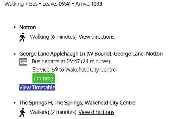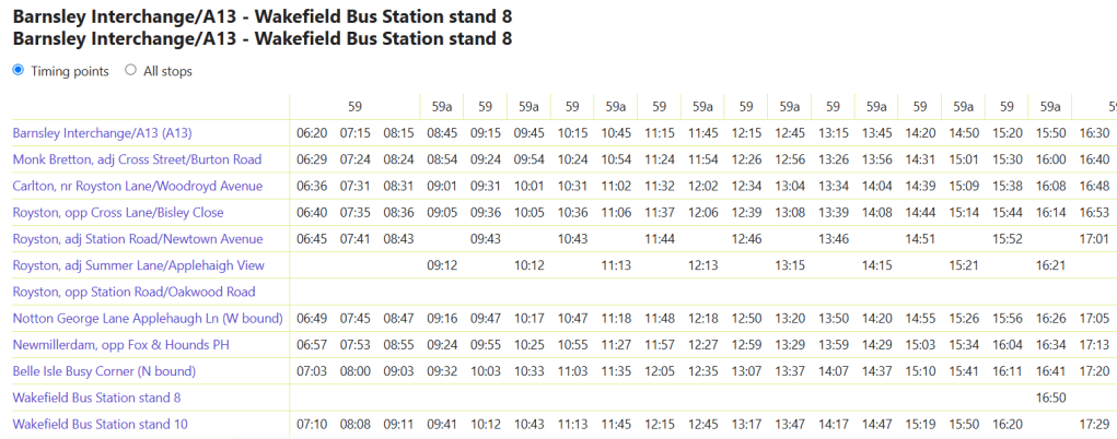 So where is the timetable? It surely exists somewhere in the WYCA databank, but where? The other route into the data is through the WYCA Journey planner – actually provided by Moovit on behalf of the authority, and this offers half-hourly buses to Wakefield (with no mention of alternate buses terminating at Royston. The same database, but a rather different interpretation? But alas, no link to a full timetable there either.