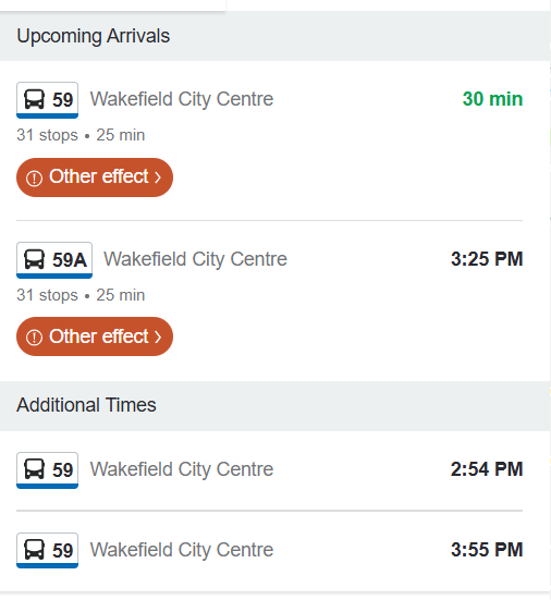 Every bus stop in the village has a list of bus departures displayed, courtesy of West Yorkshire Combined Authority (WYCA). Except that none of the displays have been updated, and there’s no mention of a change to the timetable. So that’s no good.