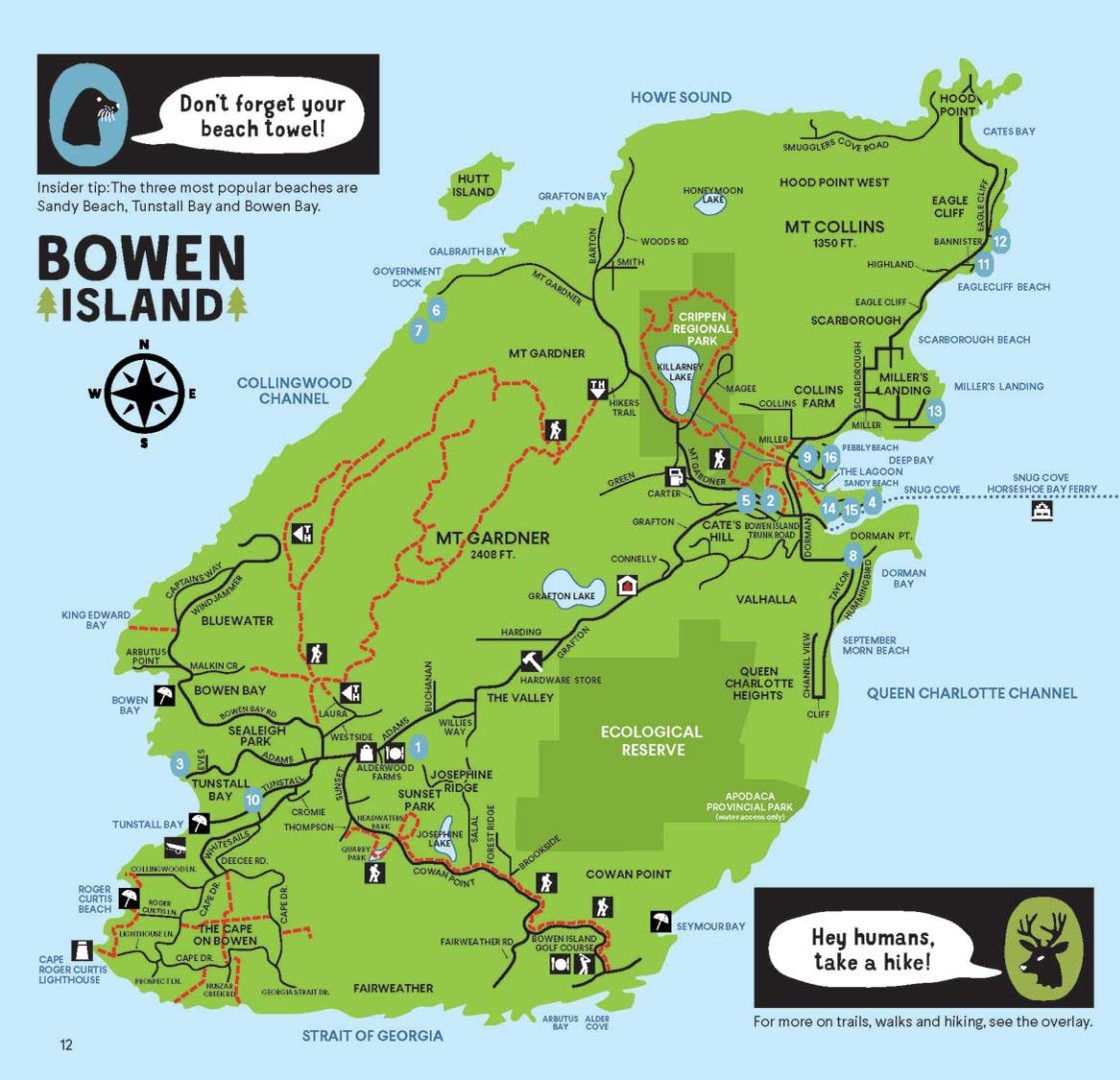 There are three bus routes but the #282 Mt. Gardner has limited service and only operates on weekends and holidays. The #280 (Bluewater) services the western side of the island, with stops in Artisan Square. The #281 (Eagle Cliff) services the eastern side of the island. Please be aware that all buses have reduced service on weekends and holidays, so ensure that you check the schedules carefully, including your return trip because you don’t want to be stranded after hours. There’s no taxi or ridesharing services on Bowen.