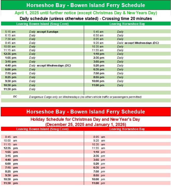 BC Ferries operates up to 15 times a day between Horseshoe Bay and Bowen Island (Snug Cove).