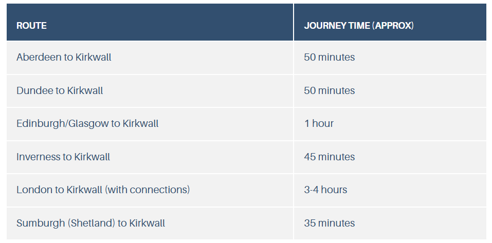 All Loganair flights to Orkney arrive and depart Kirkwall Airport just 4 miles southeast of Kirkwall.
