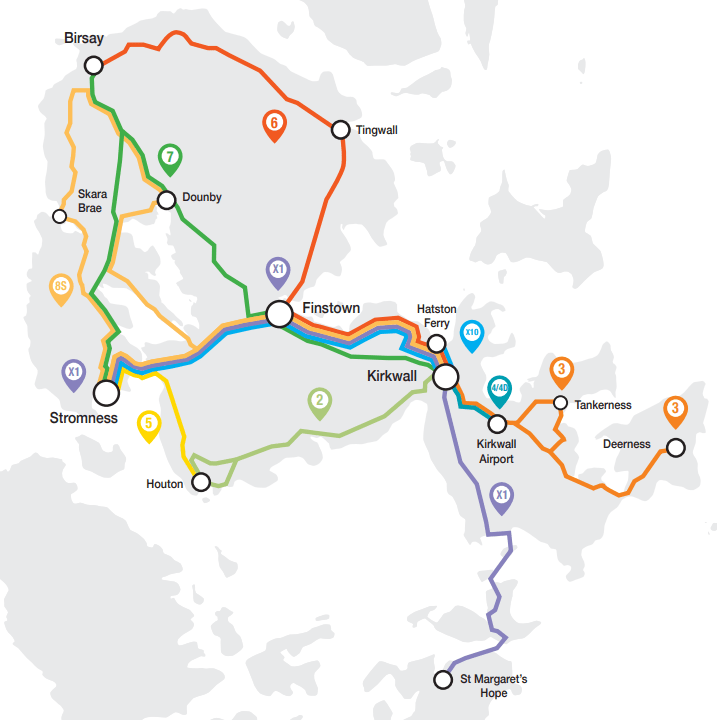 Stagecoach operates a network of bus services across mainland Orkney providing connections with inter-island ferry services and Kirkwall Airport. The principal bus routes are shown on the map below.