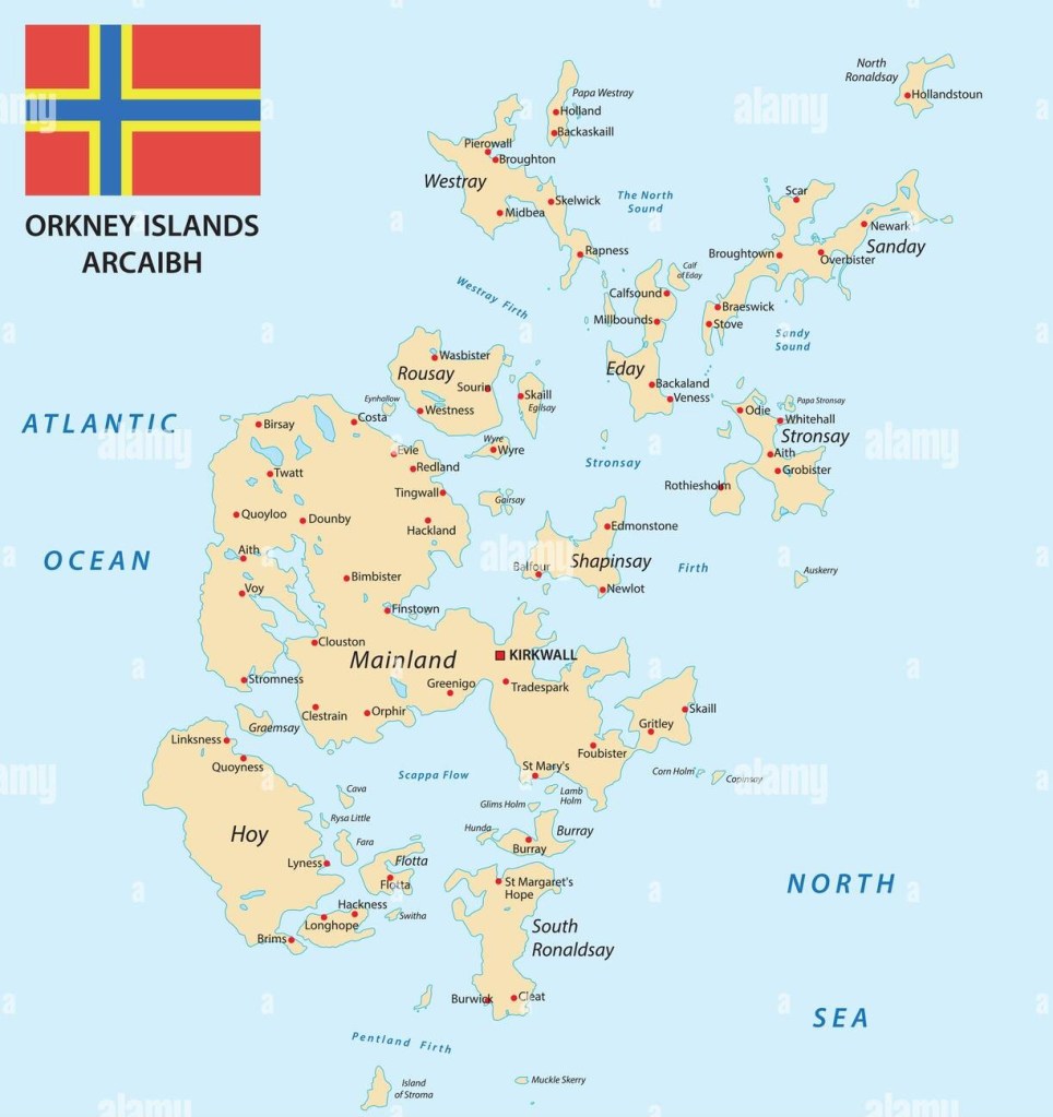 The Orkney Islands – more commonly known simply as Orkney – is an archipelago off the north coast of mainland Scotland. Part of the Northern Isles along with Shetland, Orkney is 10 miles (16 km) north of Caithness and has about 70 islands, of which 20 are inhabited. The largest island, the Mainland, has an area of 523 square kilometres (202 sq mi), making it the sixth-largest Scottish island and the tenth-largest island in the British Isles. Orkney’s largest settlement, and also its administrative centre, is Kirkwall.