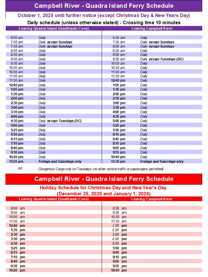 BC Ferries operates up to every 30 minutes between Campbell River and Quathiaski Cove on Quadra Island.