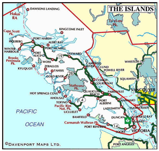 | For visitors from Europe, it’s easy to underestimate just how big Vancouver Island is. Vancouver Island covers a land area larger than Scotland or Belgium, but with a population of less than 1 million. Half of the population lives in and around Victoria in the far south of the island, with huge tracts of forest and mountains across the north, serviced by a handful of smaller towns and cities. The northernmost tip of Vancouver Island lies at the same latitude as the south coast of England. |